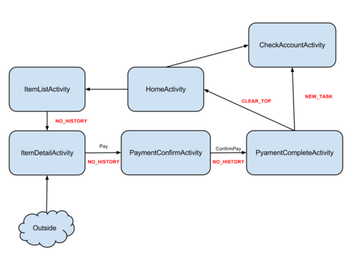 Last and THE most seriously problem is, if the user enter the Application in the ItemDetailActivity, If the user navigate towards HomeActivity, the application will be force closed! This is unacceptable. But if the flag is not added, the user maybe able to be navigate back to the PaymentConfirmActivity, this is not a desirable, and can have disasterous effect(the user may be charged twice!)